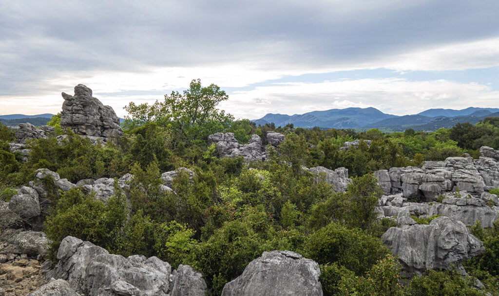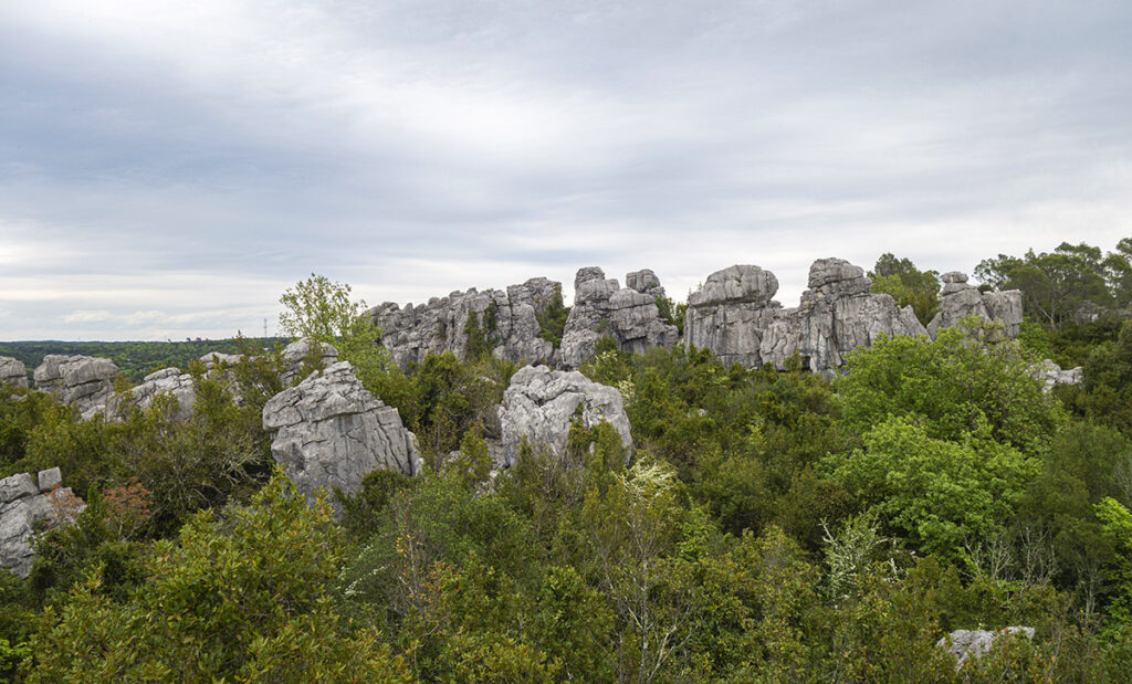 Sur les hauteurs de Sauve on trouve le plateau du Coutach (ça se prononce « couta » pour faire local). C’est ici qu’il y a la fameuse Mer des Rochers. On y grimpe par un sentier bien indiqué depuis le village. La Mer des Rochers c’est un étonnant chaos calcaire, avec des grands rochers dressés un peu partout dans la végétation 🙂