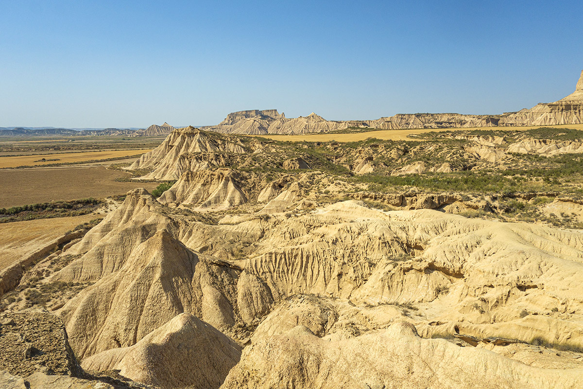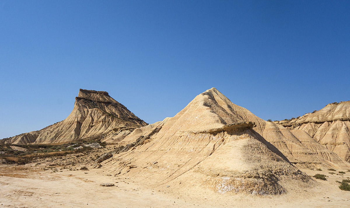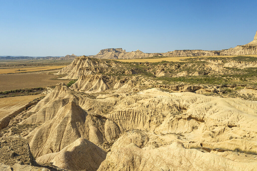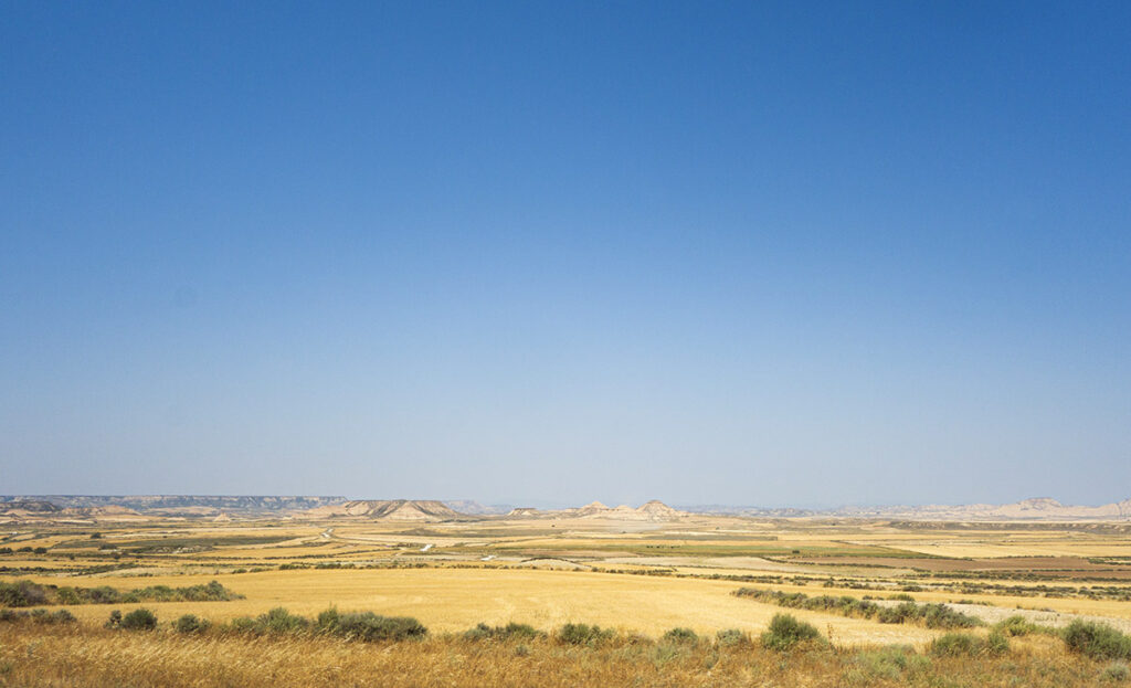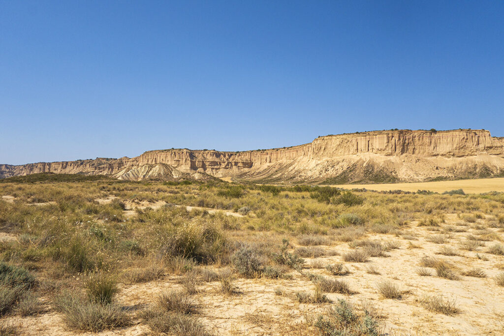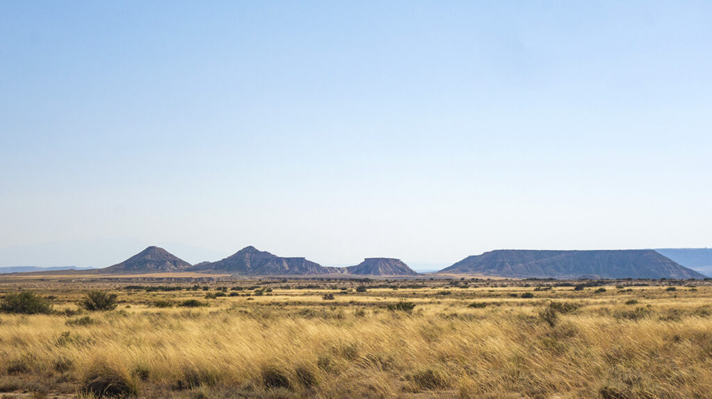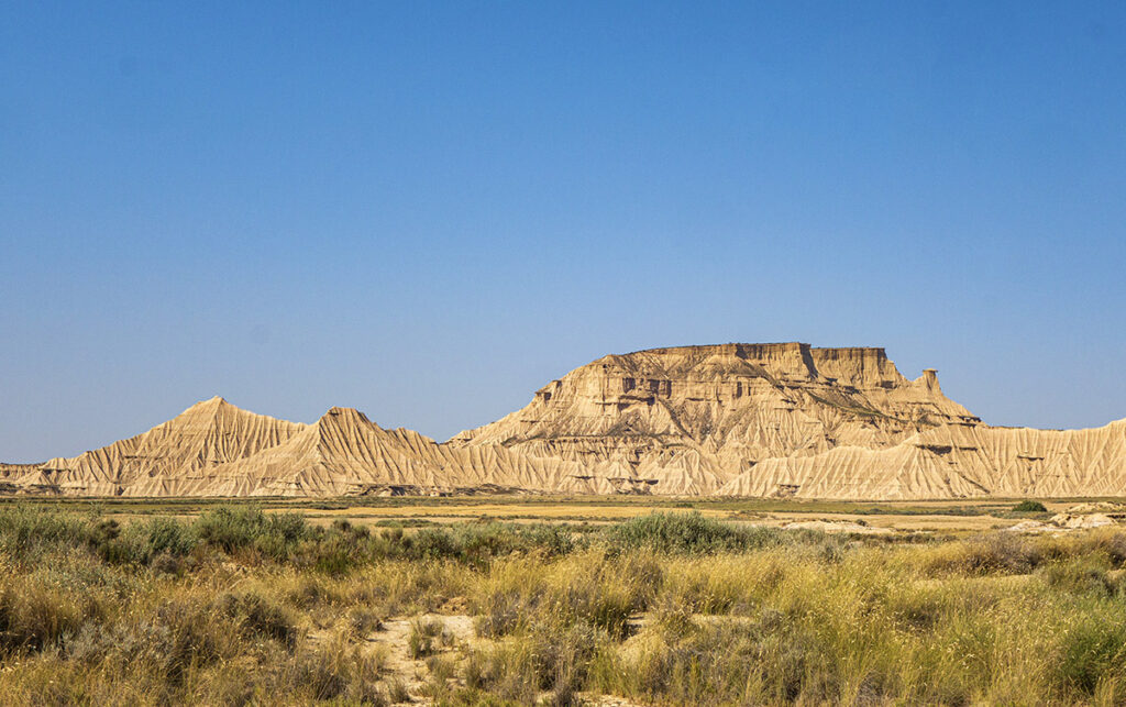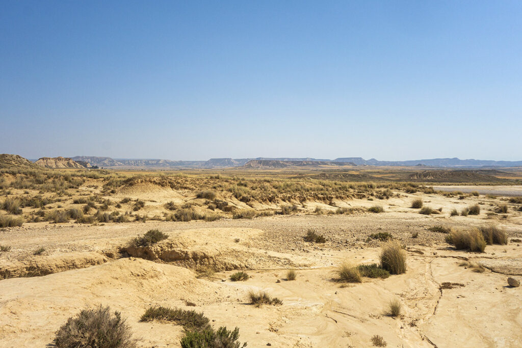 Vous ne rêvez pas, il y a bien un grand désert près des Pyrénées, à moins de deux heures de la frontière avec la France. Le désert des Bardenas Reales, c’est une des plus vastes zones désertiques d’Espagne qui s’étend sur 392km². Pas de dunes de sables géantes comme dans le Sahara, ici le désert c’est une grande étendue aride et plane. Des anciens fleuves et lacs se sont asséchés il y a bien longtemps en laissant d’importants dépôts de sédiments. Le sol est pauvre, plat, balayé par les vents et cuit par le soleil. Bref, c’est le désert! 🙂