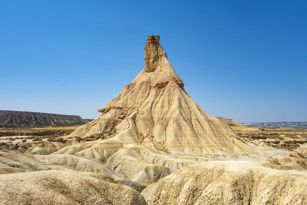Peu après le mirador, à un carrefour, il est temps de quitter la route goudronnée qui mène jusqu’à la base militaire. Prenez sur la gauche pour suivre la piste en terre. On arrive ensuite à l’emblème du désert des Bardenas Reales : Castildetierra! C’est une étonnante formation rocheuse, une cheminée de fée au milieu de nul part. Il s’agit en fait d’une ancienne colline d’argile dont il ne reste plus qu’un bloc de grès au sommet. Tout le reste a disparu après des millénaires et des millénaires d’érosion!