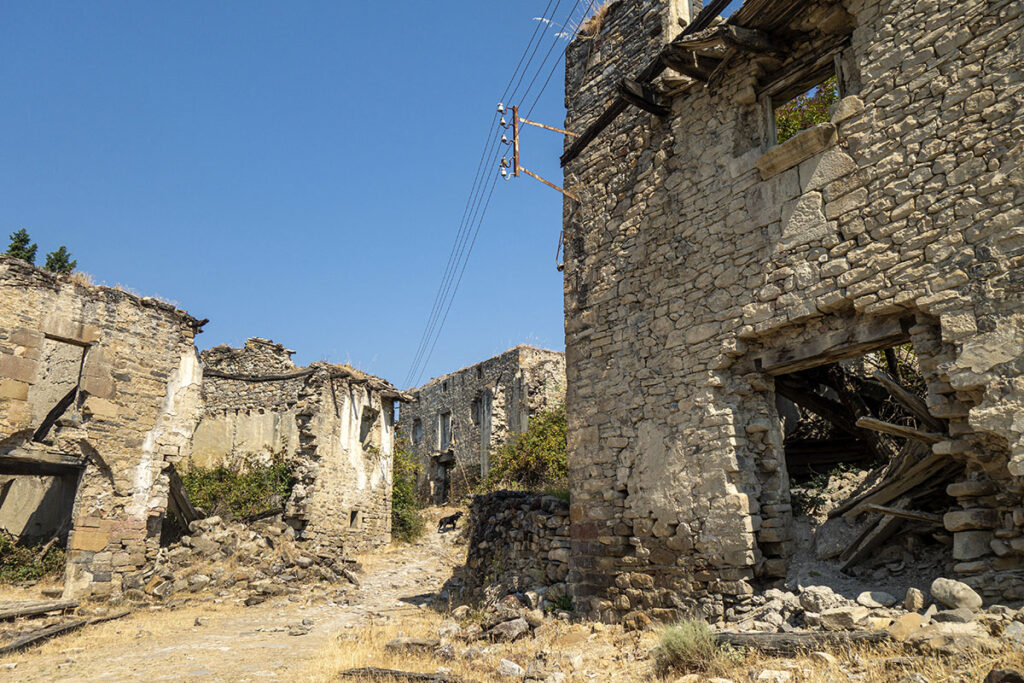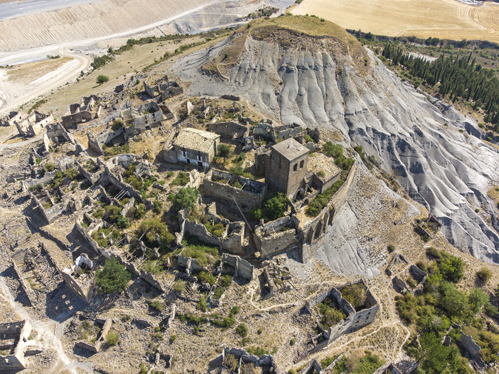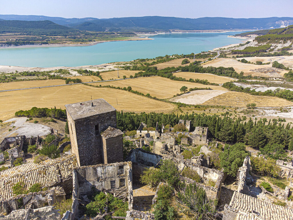 Il est perché à 568m d’altitude sur une petite colline. Il n’a jamais été submergé par les eaux du lac, mais pourtant tous les habitants ont été exproprié. Pour forcer la ruine du village et éviter que d’autres personnes tentent de s’y installer, les autorités ont volontairement défoncées toutes les toitures des maisons.