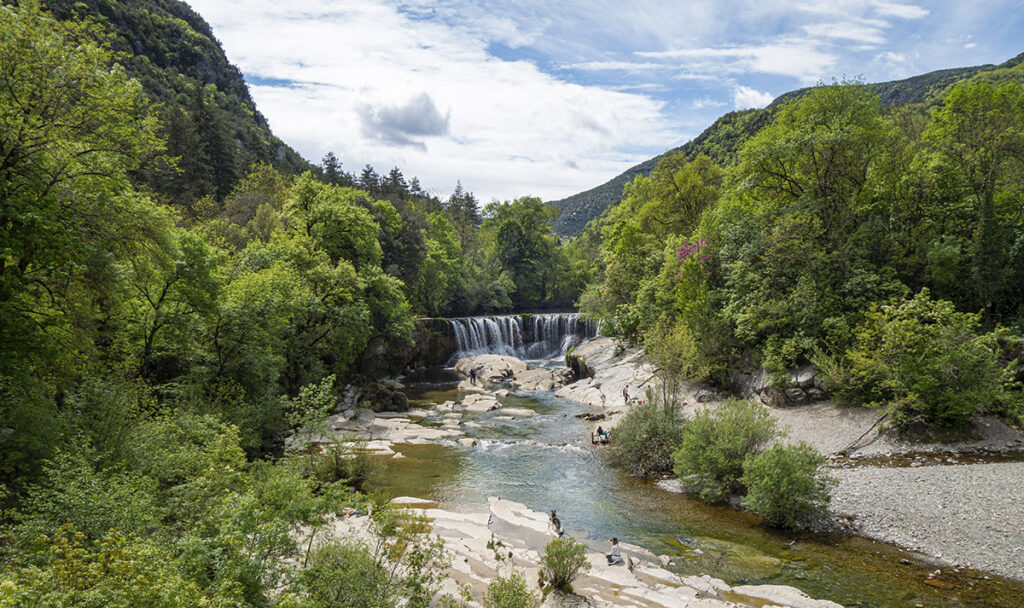 Aux origines, la rivière de la Vis faisait un méandre de plus et une large boucle. Puis au fil du temps, avec l’apport de tuf calcaire déposé par la rivière, ça lui a permis de déborder et franchir ce passage par une cascade, délaissant ainsi l’ancien lit de la rivière totalement à sec depuis.