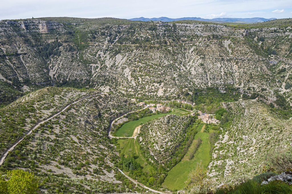 C’est à cet endroit que se trouve le hameau de Navacelles qui a donné son nom au site. Les premières habitations datent du IXe siècle, lors de l’arrivée de moines en provenance de l’abbaye de Gellone. C’est d’ailleurs un magnifique endroit à découvrir à Saint-Guilhem-le-Désert 😉 Pour visiter ce minuscule hameau, sa cascade et son vieux pont du XVe siècle, il faudra descendre le long d’une route sinueuse et croiser les doigts pour trouver de la place sur le petit parking payant (4 eur la journée). Une très bonne alternative, c’est de laisser votre voiture à un des deux belvédères, et utiliser le service de navettes gratuites. Elles font régulièrement le trajet entre le site de Blandas et la Baume Auriol, en s’arrêtant évidemment à Navacelles.