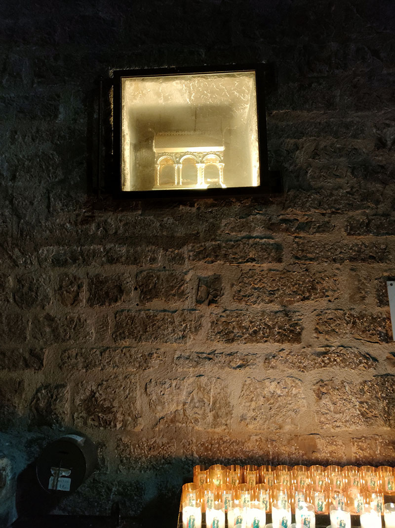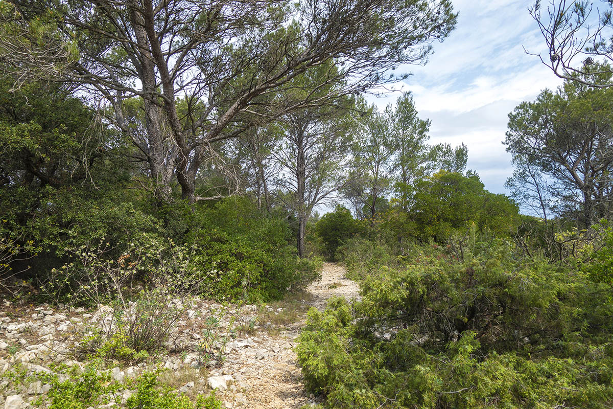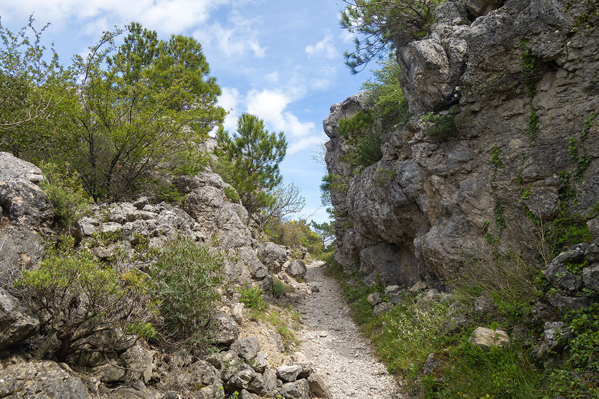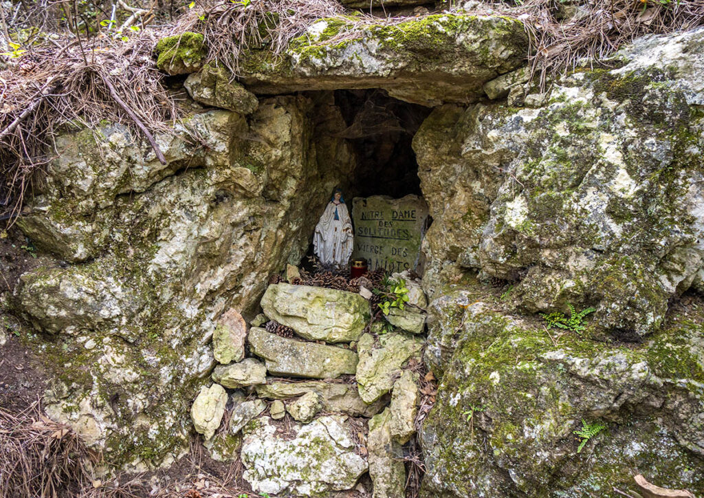 On retrouve un sentier caillouteux qui zigzague dans la garrigue et les rochers. En longeant le Saut des Mazérages, on descend de 200m d’altitude. Si vous êtes un peu curieux, au niveau du croisement des différents sentiers, prenez celui qui part vers le nord-ouest et s’enfonce dans la végétation. Après quelques minutes, vous découvrirez la statuette de Notre-Dame des Solitudes, cachée dans une mini grotte.
