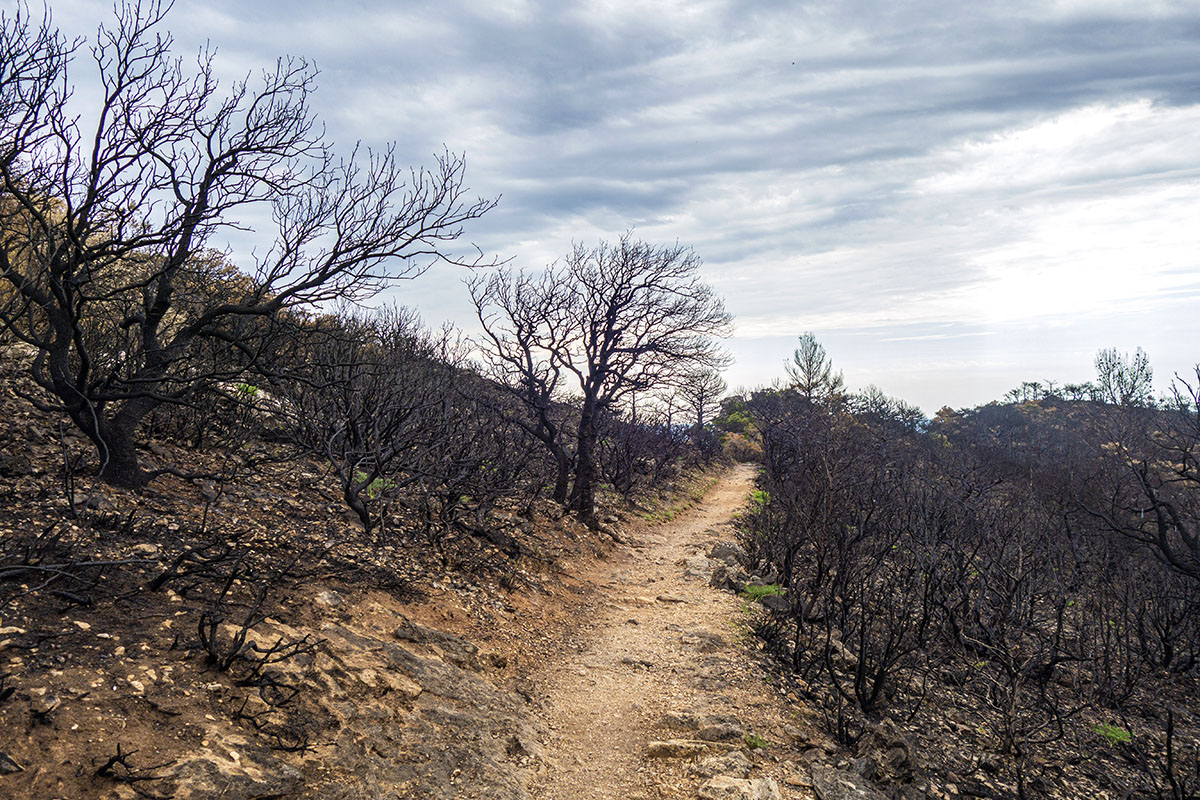 Le sentier descend ensuite vers le plateau rocheux du Roc de la Bissonne. Lors de cette randonnée, le paysage se remettait difficilement d’un feu de forêt survenu deux mois auparavant. Il y avait toujours une odeur de cendre et il s’en dégageait aussi un grand sentiment de désolation et de gâchis.