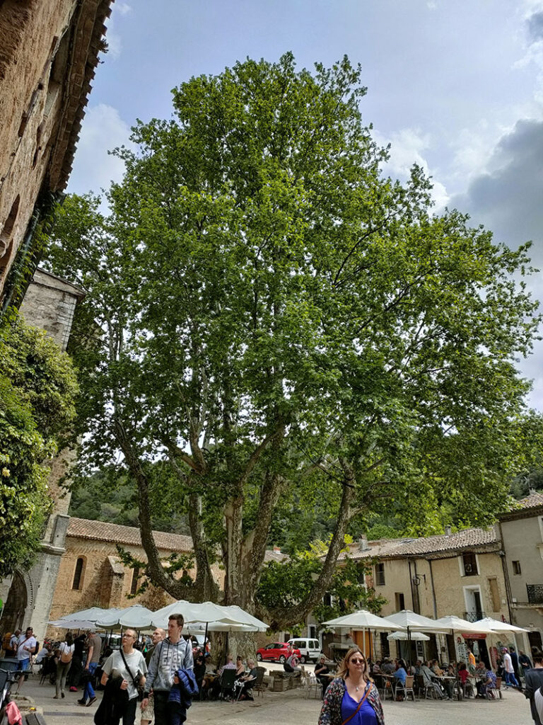 Après avoir franchi une antique porte médiévale, le chemin débouche enfin dans le joli village de Saint-Guilhem-du-Désert, classé dans « Les plus beaux villages de France ». Dès qu’on arrive sur la place du village, on aperçoit au centre le Roi Platane qui trône fièrement. C’est un grand platane (classé « arbre remarquable de France ») âgé d’au moins 165 ans et qui mesure plus de 20m de haut! C’est une fierté du village! C’est aussi l’endroit parfait pour boire un rafraichissement bien mérité à l’ombre 🙂