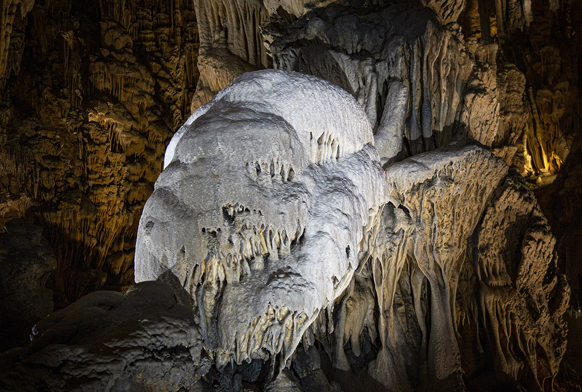 Aux origines, cette salle était remplie par un grand lac souterrain. Lors de sa disparition il y a 700.000 ans environ, c’est le début de la formation des concrétion. Le résultat ce sont ces incroyables stalagmites et stalactites, ces draperies et ces piliers. Une de ces formations les plus connues, c’est celle de « la Vierge et l’Enfant », qu’on voit ici au premier plan.