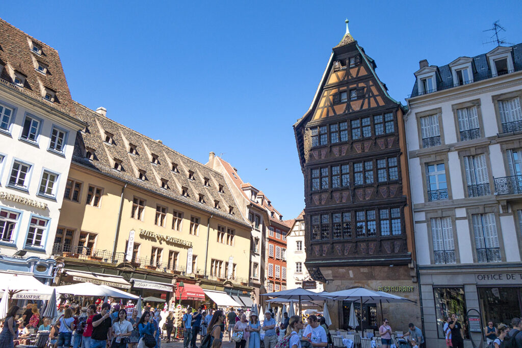 La Place Kléber est bordée par le grand bâtiment de l’Aubette. Cette ancienne caserne où les ordres étaient donnés à l’aube (d’où son nom) est maintenant à moitié un centre commercial (L’Aubette shopping) et à moitié un musée (Aubette 1928, gratuit). À deux pas de la place, ne manquez pas la façade décorée de la pâtisserie Christian au 12 rue de l’Outre. Cette peinture en trompe l’œil date de 1987 lors de la restauration de cette bâtisse du XVIe siècle. Au passage, c’est aussi la pâtisserie la plus réputée de la ville, avis aux gourmands (la carte ici) 😉