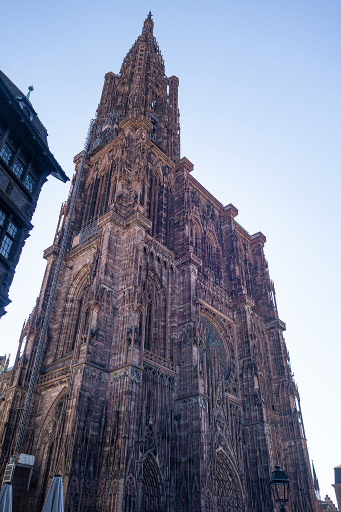 Aux origines, il y avait ici un ancien sanctuaire celte ou romain, puis une précédente grande cathédrale romane brulée lors d’un incendie. Alors au XIIe siècle on lance les grands travaux pour une nouvelle cathédrale majestueuse en grès rose! D’abord construite dans un style Roman, l’arrivée d’un nouvel évêque en 1220 change tout, il veut absolument du Gothique. En 1360, elle ressemblait beaucoup à Notre-Dame de Paris avec ses deux tours. Mais changement de plan, on décide de remplir l’espace entre les deux tours! et on se dit « Pourquoi pas une grande flèche par dessus tout ça? » Banco! En 1399, la ville embauche l’architecte le plus réputé du moment, Ulrich d’Ensingen. Il a travaillé sur la grande cathédrale de Milan (que je vous présente sur cette page) et la grande cathédrale d’Ulm. La flèche est finalement achevée en 1439 et culmine à 142m. Strasbourg possède maintenant le plus haut bâtiment du monde! Evidemment, on aimerait une deuxième flèche, mais aucun projet ne sera retenu.