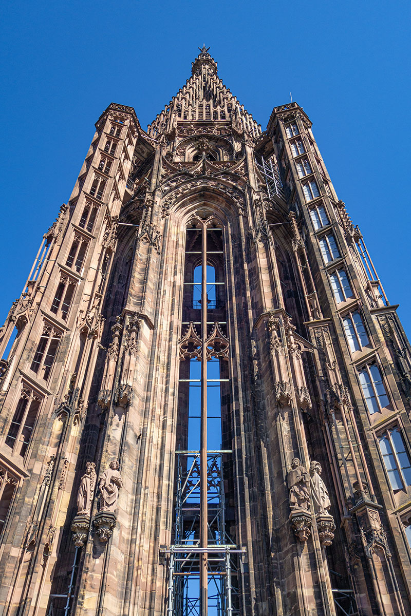 Depuis la plateforme on peut aussi admirer d’un peu plus près l’impressionnante flèche qui atteint 142m de haut. Une véritable dentelle de pierre, toute en finesse et en légèreté. On a du mal à s’imaginer le travail des derniers tailleurs de pierre perchés sur des échafaudage au dessus du vide. Il ne fallait vraiment pas avoir le vertige pour installer la dernière pierre!