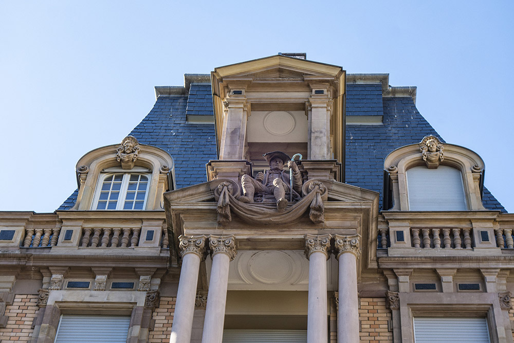 Un peu plus loin, au 5 rue Saint Léon, il y a un autre détail insolite à voir à la maison Muller Simonis. Dans cet immeuble qui abrite désormais Caritas Alsace (une structure du Secours Catholique), il y a un étrange personnage assis au 3e étage. C’est l’Elsässer, symbole de l’alsacien et du journal « Le Nouvel Alsacien » qui était imprimé dans la cour de l’immeuble.