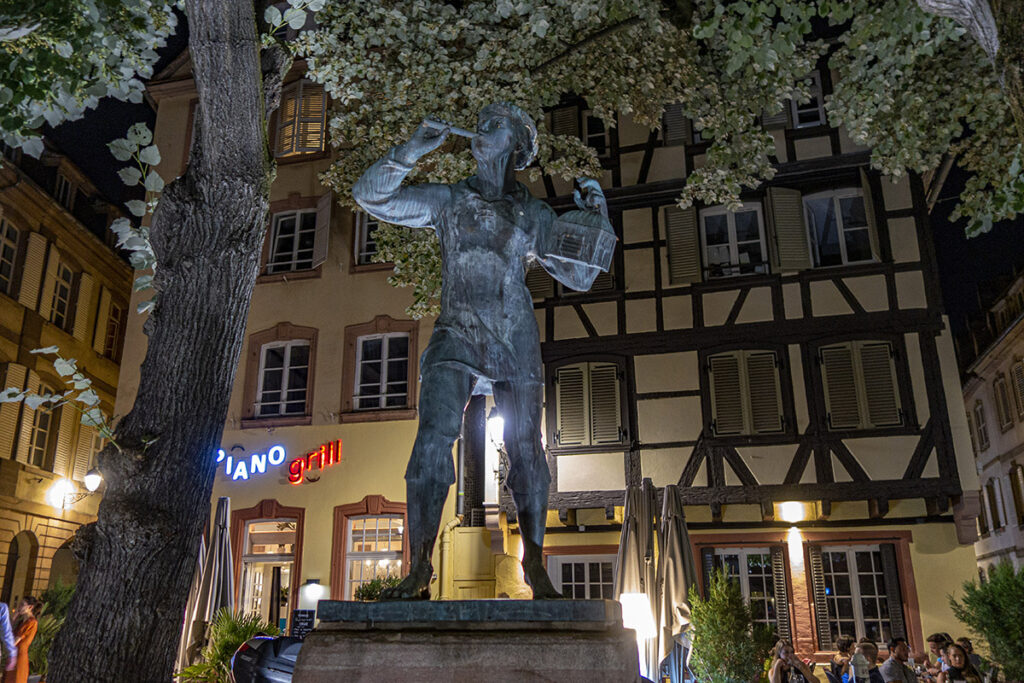 Cette statue représente un Meiselocker, un charmeur de mésanges. C’est un des surnoms des strasbourgeois. La tradition voulait qu’au printemps, les jeunes allaient à la campagne jouer de la flûte pour attirer et capturer des mésange, pour les vendre ensuite aux marchés en ville.