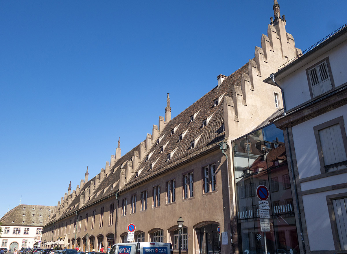 Sur le quai, on aperçoit un grand bâtiment, c’est l’ancienne douane de Strasbourg. En 1358, ces douanes servaient à contrôler, taxer et stocker les marchandises naviguant le long du Rhin tout proche (principalement de vin, poisson, sel et tabac). Pendant tout le moyen-âge, c’était le plus grand bâtiment civil de Strasbourg. En 1803, les douanes disparaissent et le grand bâtiment héberge des marchés. Il est pratiquement détruit par les bombardements de 1944, mais il sera reconstruit en 1966. Maintenant il abrite un restaurant, des ateliers et une salle exposition.
