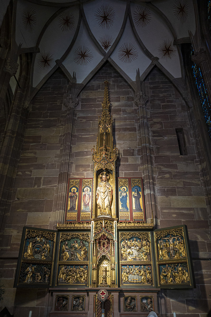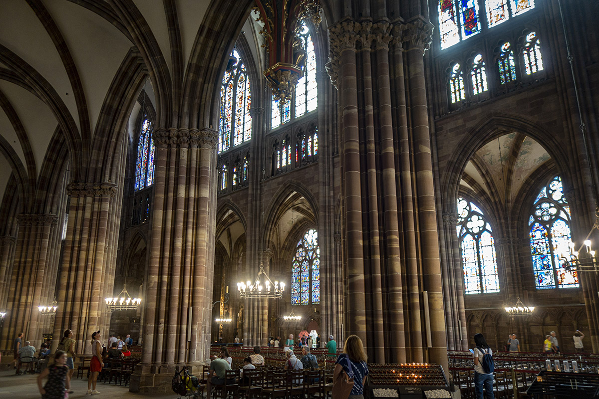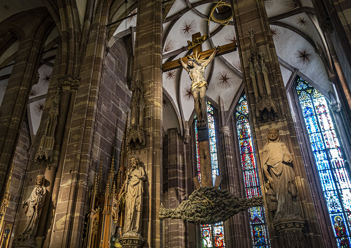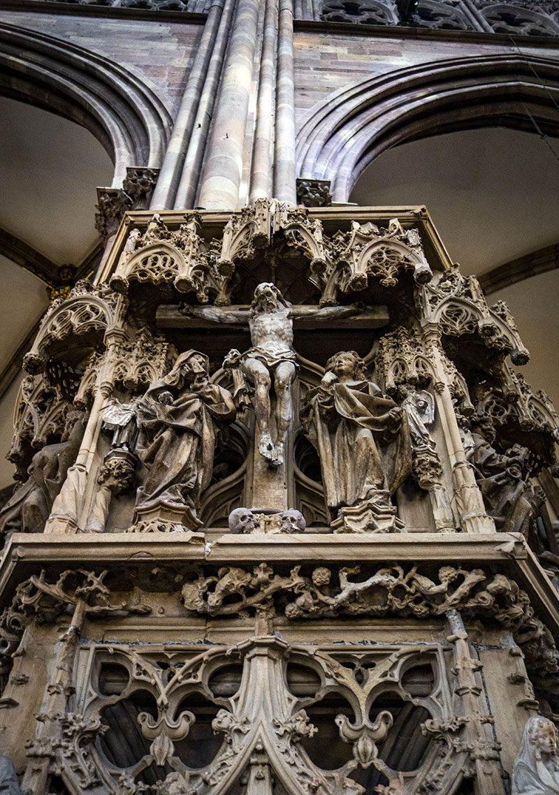 Vous découvrirez par exemple la très belle chaire de pierre réalisée au XVe siècle pour le prédicateur Jean Geiler. C’est un formidable chef d’œuvre avec des sculptures fines et délicates. Insolite, cette chaire abrite un petit chien sculpté. Il a été rajouté en référence au chien du prédicateur qui l’accompagnait toujours quand il montait pour faire ses sermons. Depuis, cette sculpture est un peu devenue la mascotte de la cathédrale. Caressée par des millions de mains, la pierre du petit chien est devenue toute noire!