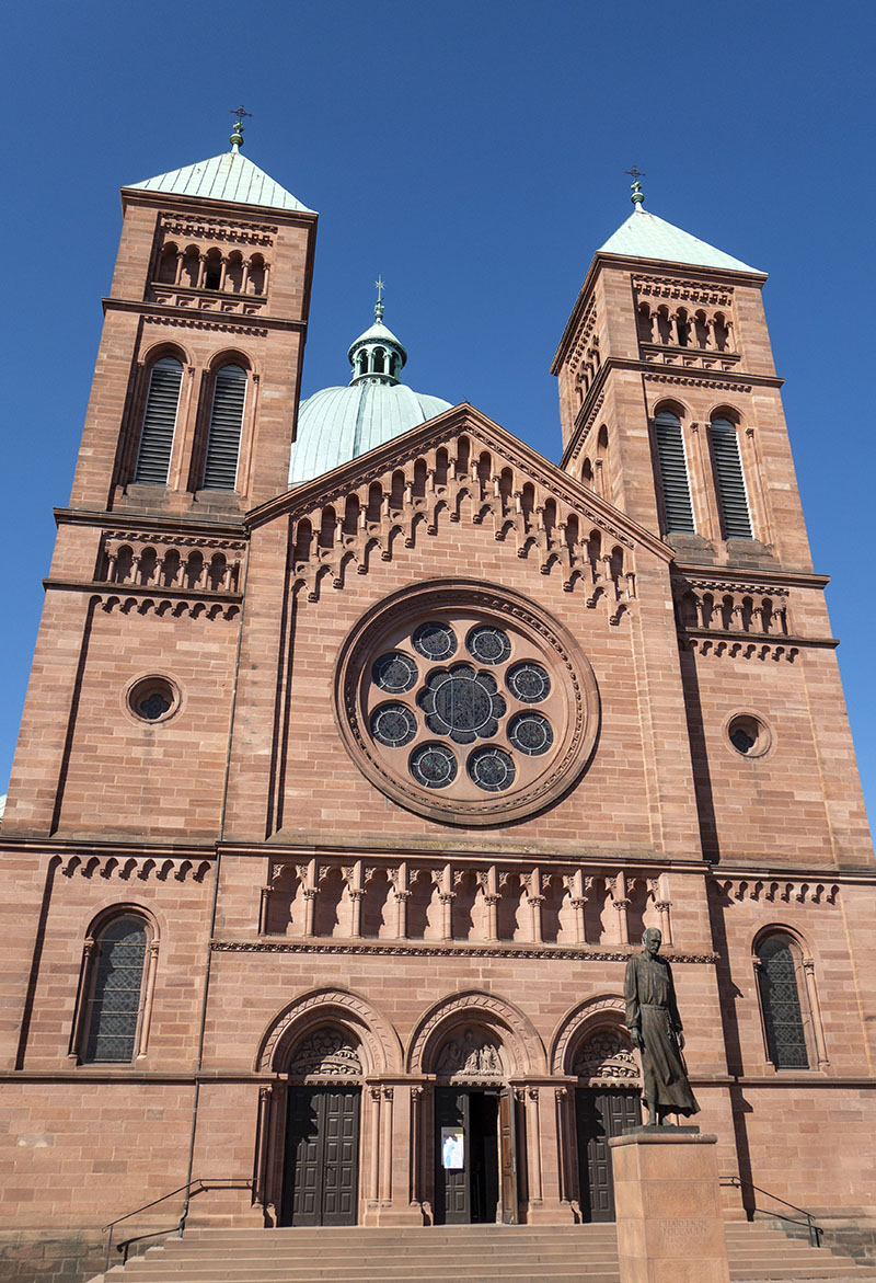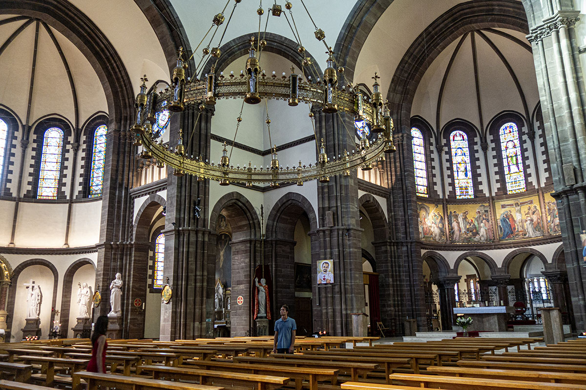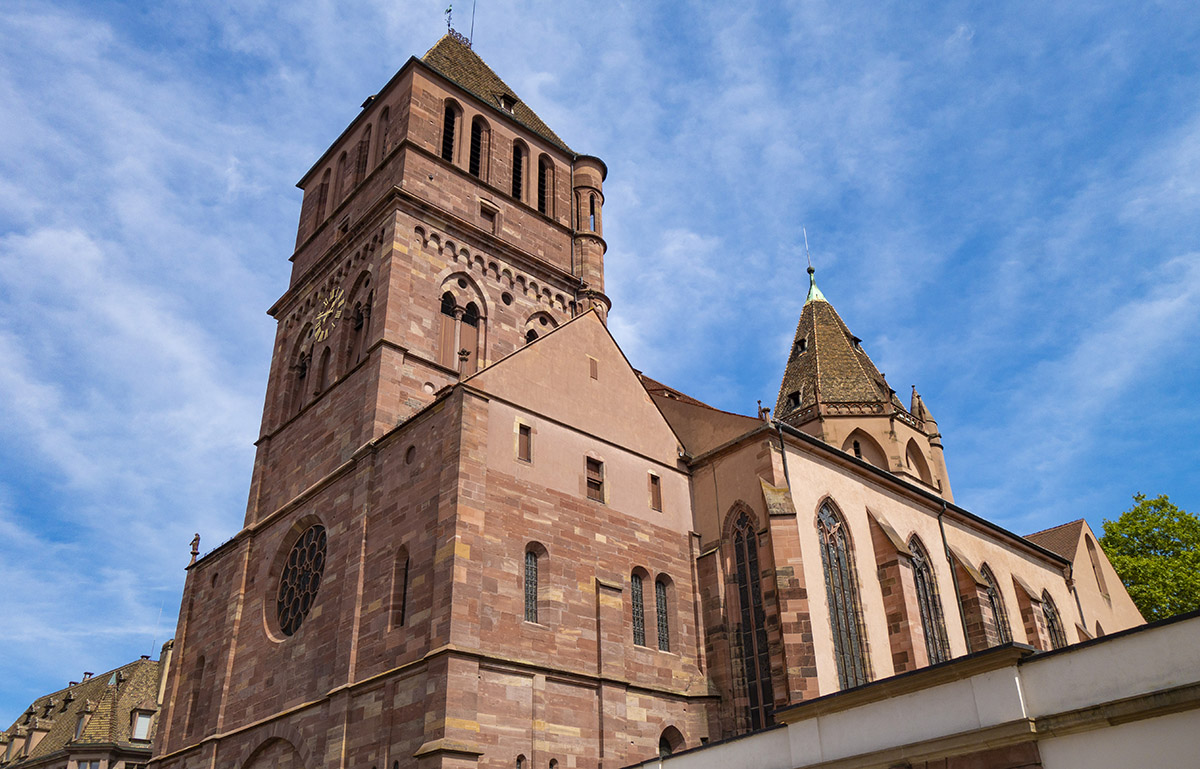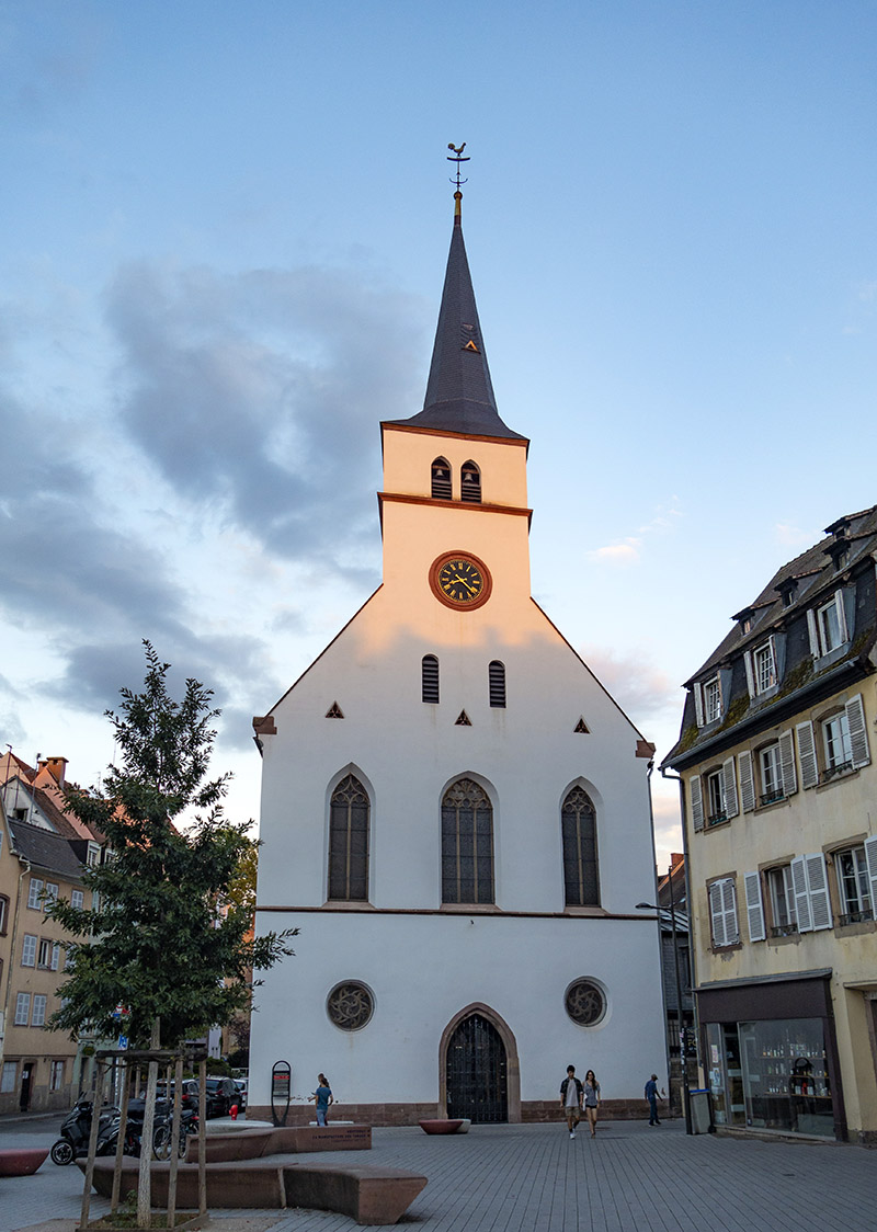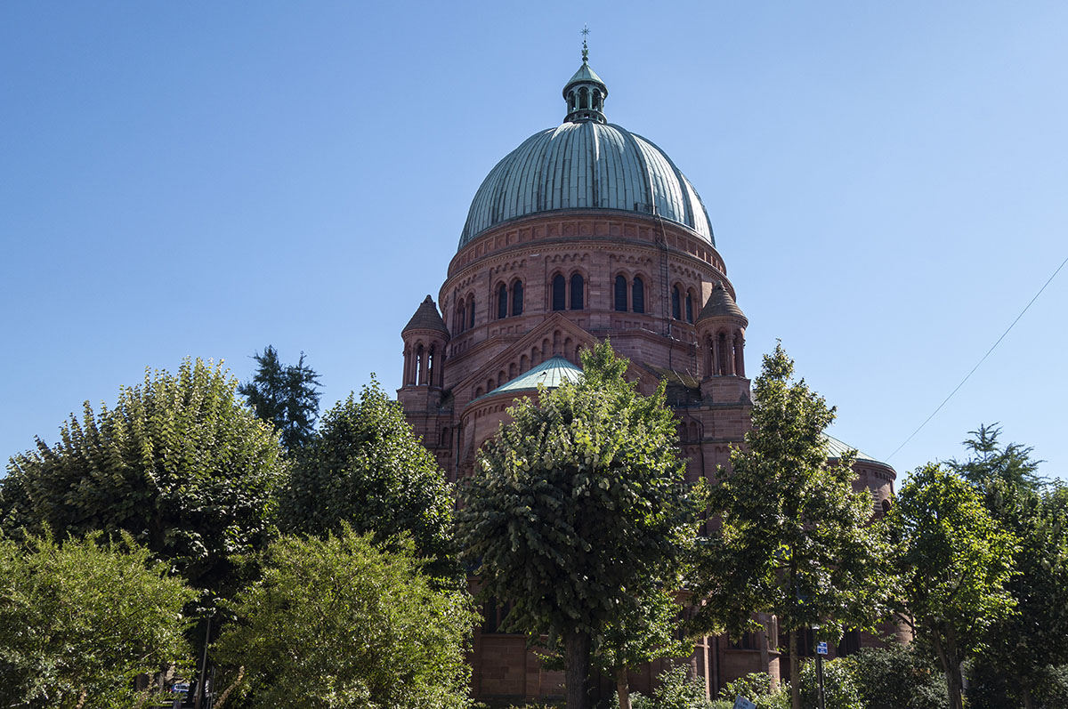 De l’autre côté de la rue, on peut admirer le grand dôme en cuivre de la monumentale église catholique Saint Pierre-le-Jeune. L’église culmine à 56m de hauteur et le dôme a un diamètre intérieur de 18m. C’est la plus grande coupole d’Alsace.