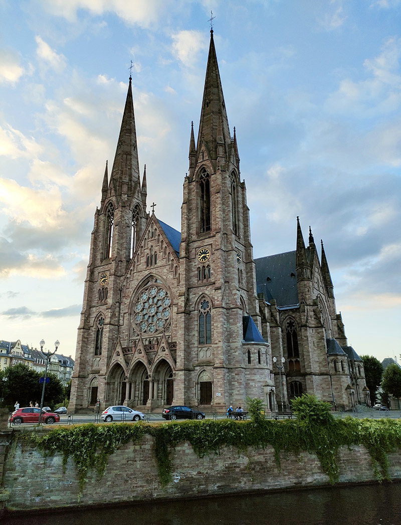 Plus loin, on arrive à la grande église Saint Paul qui ressemble à une cathédrale gothique. On la voit de loin avec les deux flèches de sa façade qui culminent à 76m de hauteur! Elle est récente car construite en 1897. Il y a 16 portes autour de l’église. La raison, c’est qu’elle a été bâtie pour la garnison allemande (protestante) stationnée à Strasbourg. Chaque porte correspond à un grade de l’armée allemande. Cette grande église fait partie du projet de la Neustadt.