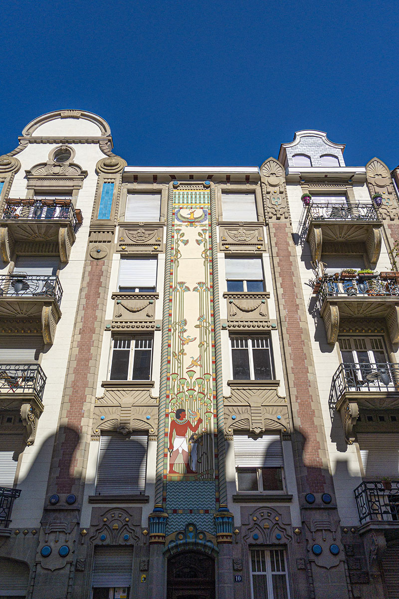 À quelques minutes à pied du Palais du Rhin, on peut découvrir une curiosité architecturale: la « maison égyptienne ». C’est un immeuble situé au 10 rue du Général Rapp. Lors de sa construction en 1906, les architectes ont voulu mélanger art nouveau et touche d’exotisme avec cette belle fresque digne de l’Egypte ancienne 🙂