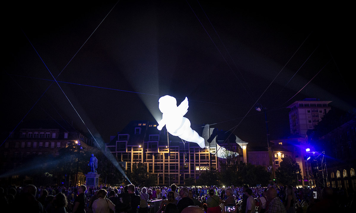 Une autre place mérite le détour. C’est la grande Place Kléber (du nom de l’ancien général né à Strasbourg). C’est la plus grande place de Strasbourg. Tous les grands évènements populaires ont lieu ici, comme le grand sapin de noël, ou le traditionnel marché de noël depuis 1570. Ce soir là, c’était un chérubin géant qui volait au dessus de la place, tout à fait normal haha 🙂