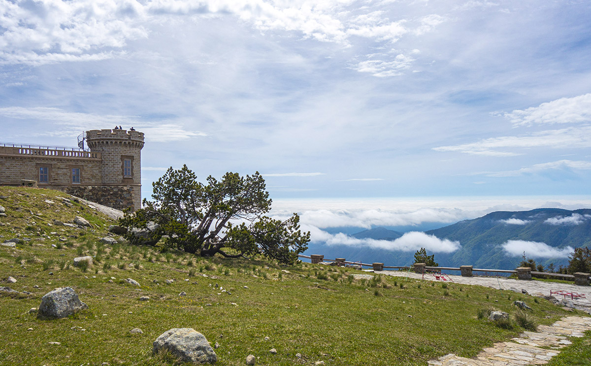 Le sommet du Mont Aigoual est occupé par une station météorologique. Sa construction qui a duré 7 ans a été très pénible à cause de la rudesse du climat. Inaugurée en 1894, elle ressemble à un château fort avec sa tour crénelée. Au sommet de cette tour se trouve une grande table d’orientation. La station du Mont Aigoual était la dernière station météo de montagne en France toujours occupée jusqu’à sont automatisation en 2023. Officiellement baptisé, « Le Climatographe », l’Observatoire du Mont-Aigoual peut se visiter 🙂 Pour un tarif de 9 Eur, vous avez accès à de grandes expositions vraiment intéressantes sur la météo et le changement climatique. Plus d’infos sur le site de l’observatoire.