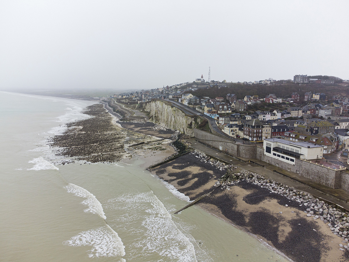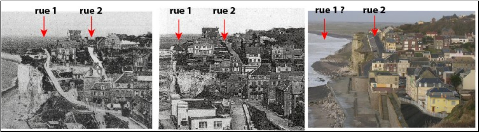 L’érosion des falaises est hélas inexorable. Elles sont composées à 90% de craie et 10% de silex. On estime qu’elles reculent en moyenne de 30cm par an! En un siècle on a observé au moins 70m de retrait. On le voit bien sur ces photos historiques où des quartiers entiers ont disparus!