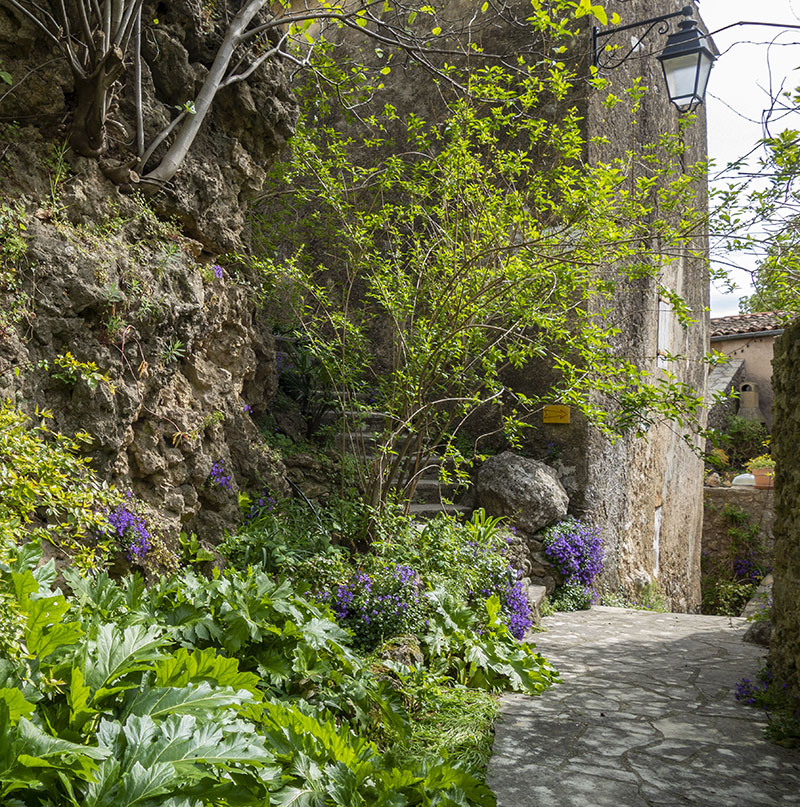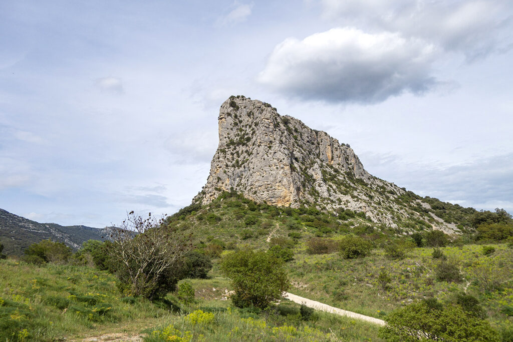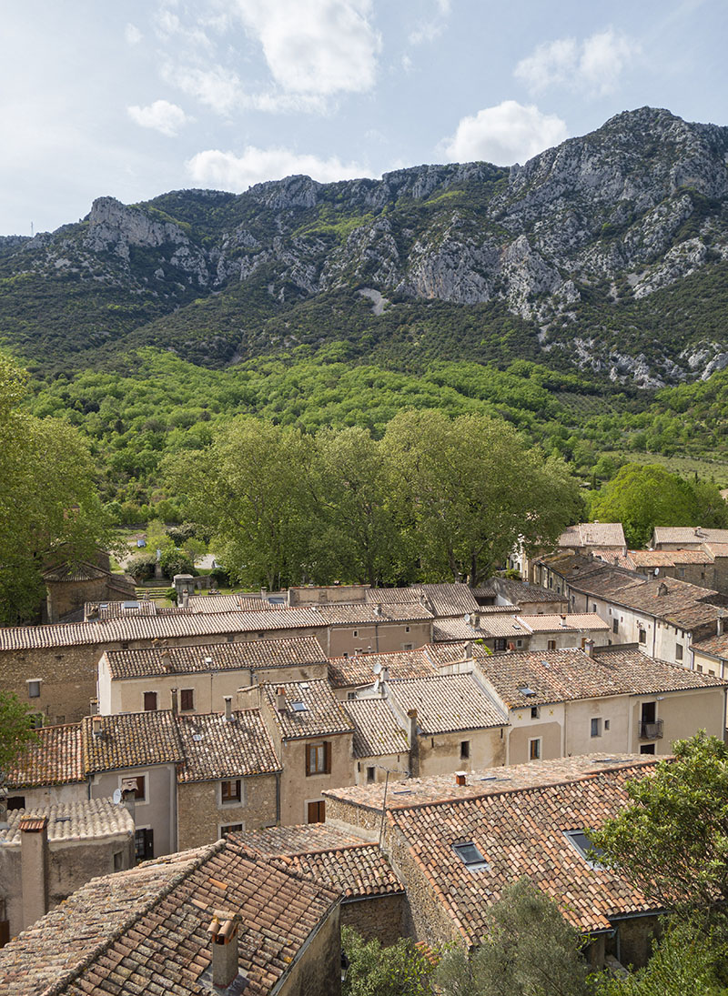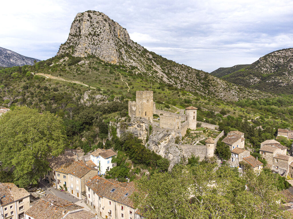 Ce qui retient l’attention quand on découvre ce village, c’est évidemment le château sur son promontoire rocheux. Le tout dominé par la grande falaise d’une montagne isolée.