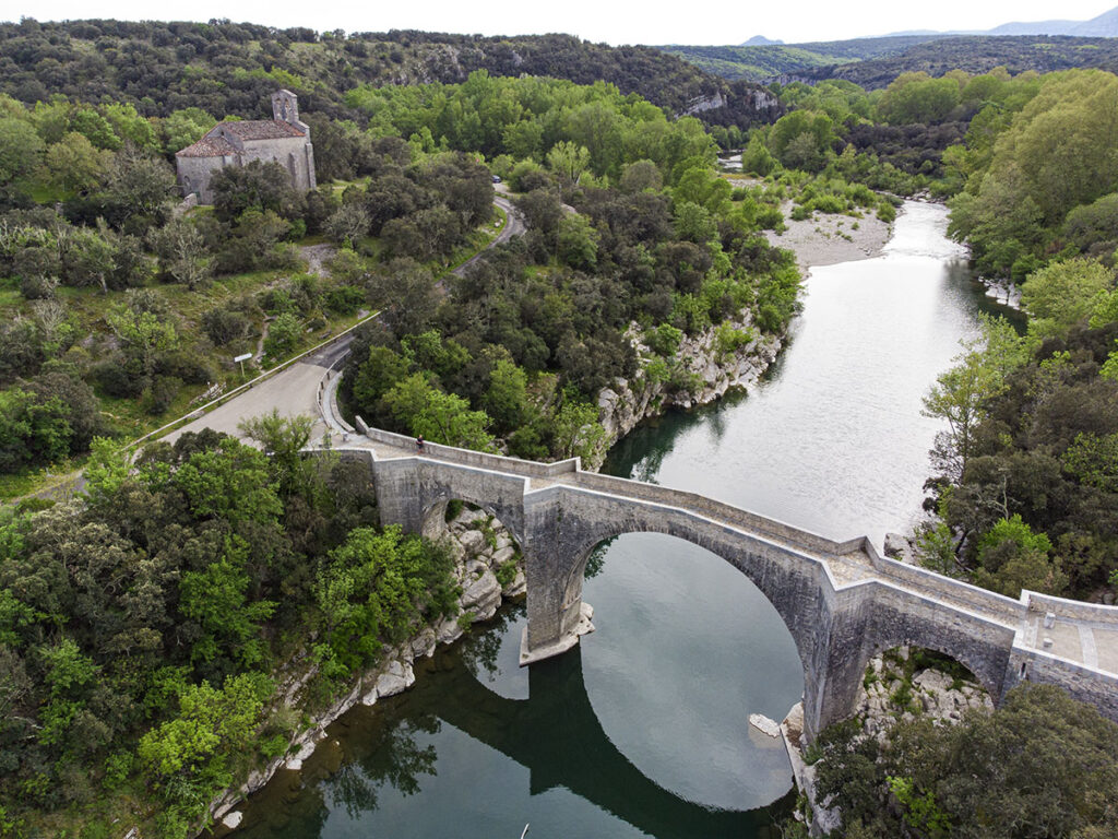 Dans un site naturel remarquable se cache un des plus beaux ponts du département de l’Hérault. À 5km de Brissac, le très joli pont Saint-Etienne d’Issensac franchit le fleuve l’Hérault. Ses dimensions n’ont rien de gigantesque. Il ne mesure que 13m de haut, avec une longueur de 60m. Il faut noter que sa largeur n’est que de 2.90m seulement. Vous pouvez tenter de le traverser en voiture, à vos risques et périls, c’est vraiment très étroit. D’ailleurs à chaque extrémités du pont, il y a des plots en pierre pour interdire le passage à tout véhicule plus large que 2m.
