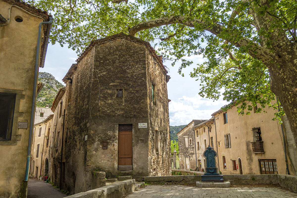 Les ruelles sont typique des villages médiévaux du Languedoc. Les grands platanes plus que centenaires invitent à se poser près de la fontaine sur une petite place ombragée. On tombe tout de suite sous le charme 🙂