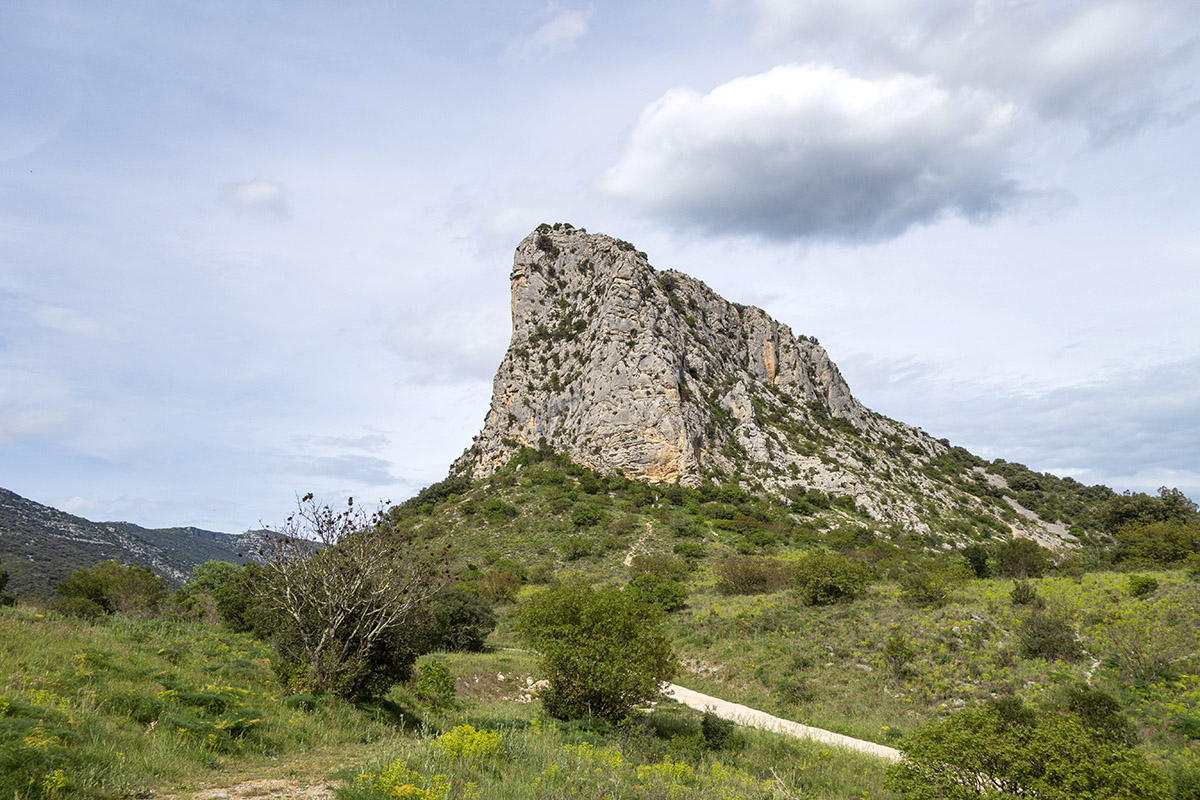 Derrière le château, l’étonnante petite montagne, c’est Roc Tras Castel. En suivant le sentier tracé, il est possible de grimper au sommet. Des petits cairns de pierres sont sensés baliser le chemin.